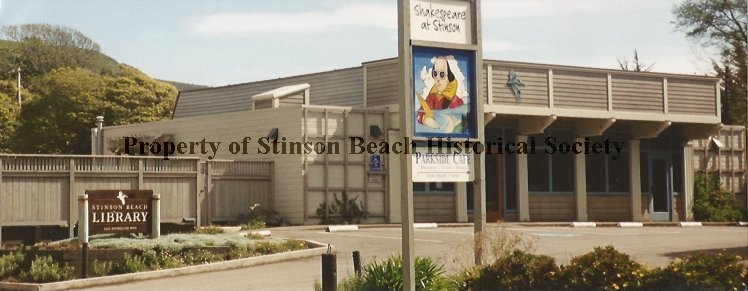Panoramic view of the new Stinson Beach Library prior to opening. A bit of free advertising for Shakespeare at Stinson and the Parkside Cafe whose sign holds centerstage. A wooden Stinson Beach Library sign is posted in front of the courtyard fence with an Egret logo. There is also a blue Pelican sculpture on the wall over the library entrance.