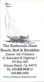This is a calling card made for Redwoods Haus Bed and Breakfast. To go with its German name the card is subtitled in German, Zimmer Mit Fruhstuck. It states the address and telephone numbers and website address.