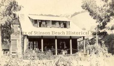 B&W postcard of the "Laffa lot" house of the Nielson Family at #1 Belvedere in Stinson Beach. The house is a 2-story wooden house with stone chimney on the left side. The roof (which is white perhaps because there is snow on it) forms an overhang supported by beams which cover an open porch. On the rooftop extend dormer windows which are open. There are several people seated on the porch in chairs - four adults and one child. There is much foliage in front of the house and trees on either side, hillside in the background. On the back of the postcard is written "The big snow storm of 1922. January 29."