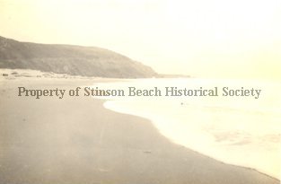A black and white photo postcard from the early 1900's. Shows surf and beach looking toward the Steep Ravine. You can see the cut of road along the cliff coming down to the beach.