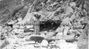 Small B&W photo shows a rocky hillside formation with a square wooden structure that make it appear as an entrance to a cave.