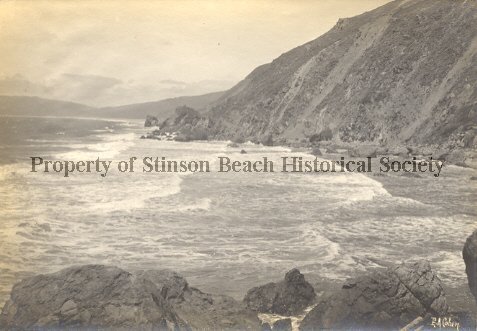 Original black and white photographic print by Edgar A. Cohen showing the cove between Rocky Point to Steep Ravine, south of Stinson Beach, looking to north. Behind the rocky point hills of Stinson Beach and the coastal ridge of Bolinas, west of the Olema Valley is shown. Rather heavy surf along the coast is seen. The Photographer's signature, E.A.Cohen, in white is at the lower right corner. On the back of the photo is: Photograph (stamped) #1844 - Cove between Rocky Pt. and Steep Ravine (penciled) Edgar A. Cohen, Alameda, Cal (stamped). Note Big Lagoon is Slide Ranch.