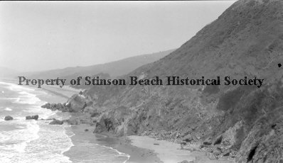 This black and white photograph looking north, depicts coastal hills on the right running down to a sandy cove bounded by rocks and boulders. Beyond the rocky outcroppings is a larger sandy beach. The cove in the foreground is at the base of Steep Ravine and has sulphur springs. The rocky outcroppings are Fishing Rocks at the south end of Stinson Beach on Bolinas Bay.