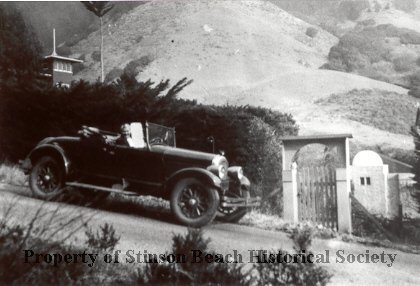 This black and white photo depicts a road with an open top car parked on it facing to the right, pointing downhill. There is a hedge and trees behind it and a gate downhill of it and hills in the background. In the upper right corner part of a house is visible behind the trees. The house appears to have a flagpole on the roof. Below and behind the gate another house is visible with a domed roof. A woman is getting out of the passenger side of the roadster. The door is ajar and her foot is touching the runningboard. The driver (a man?) appears to be moving toward his door on the driver's side. The location is just uphill from Peggy Pepper's house (70 Laurel Ave.).