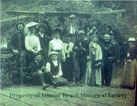 Xerox copy from slide of a group of travelers standing (plus a couple sitting) in front of the Willow Camp buggy (sign on buggy is slightly visible) boarding site. Ladies are mostly in broad brimmed hats and long dresses. Men are variously and casually attired, mostly in hats. One trickster holds a water bottle over the head of female in long coat.