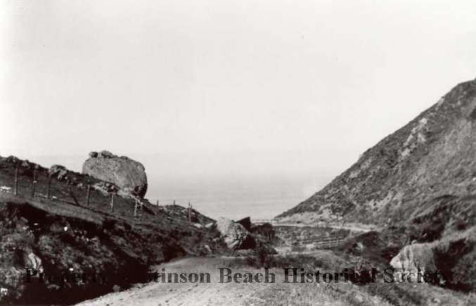 Black and white photograph of unpaved Outside Road (Highway 1), south of Stinson Beach, with embankments rising on both sides. This is close to Steep Ravine where a trail leads down to the beach and the Sulphur Hot Springs.