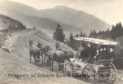 A B&W photograph of the Stage coach drawn by 4 horses and its 6 passengers. The stage ran between West Point Inn on Mountain Train to Willow Camp and McKinnon's Landing on Bolinas Lagoon. It shows the gravel grade going up Mt.Tamalpais. See notes.