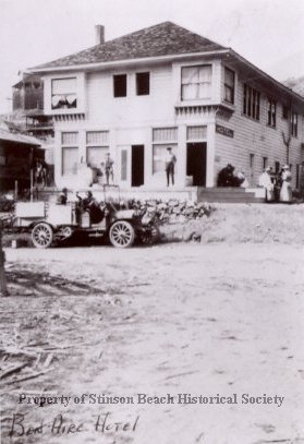 Black and white photograph of Airey Hotel taken from south. The building occupies the upper half of the picture. Two men stand looking toward present Highway 1 where a vintage chain-drive flat bed truck with three men is parked. A sign "Hotel" is hung on the east side of the building and 4, 5 ladies in long skirted dress are standing and sitting on the bench. It is written on the lower left, Bon Aire Hotel.
