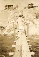 A woman stands with her back to the camera on a wooden trestle spanning what appears to be a river. On the far side is a steep rocky embankment on the top of which is parked two vintage automobiles. There is a person standing by each vehicle looking down at her. The woman is wearing a skirt and longish sweater. Her arms are slightly out at her sides as if balancing herself.