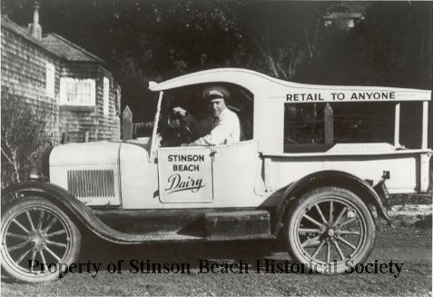 Black and white photograph of Stinson Beach Dairy truck on Willow Street (2001). The driver (Joe Avila) is smiling out the window with his right hand on the wheel. He is wearing a white, visored cap and white "milkman's" jacket. The truck is white. There is a sign on the door reading STINSON BEACH DAIRY and on the side of the roof over back portion of the truck it says RETAIL TO ANYONE. On the right, in front of the truck is a shingled house. See notes.