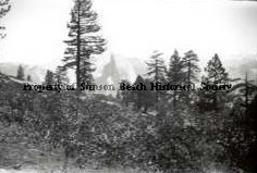 View of pine trees and brush silhouetted against the sky and the distant mountains.