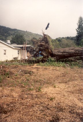 Series (36) of 4x6 color photographic prints showing the storm damage to the G.G.N.R.A. Stinson Beach Park and clean up. Damage was mainly of the Monterrey Cypress trees in the parking area and the Park Service cleared all the downed trees as well as the damaged ones. Photographs were taken by Barbara Scott who owned the Parkside Cafe at the time of the storm.