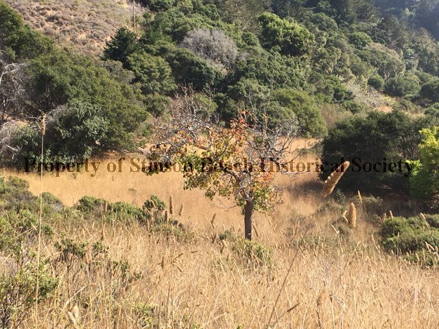 This is a digital photo of a fruit tree standing on the hillside field of the old Stinson Ranch. It is planted on the hill but near a watery spot with nearby grasses still green in September. It is very small, about 8 feet tall with spread of 5 feet or so. The leaves indicate some fruit like an apricot.