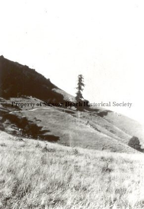 A tall skinny pine jutting out on a barren hillside is identified in the photo album as follows: "The Lone Tree - Almost at camp on the way over and on the way home the worse over when we reach this."