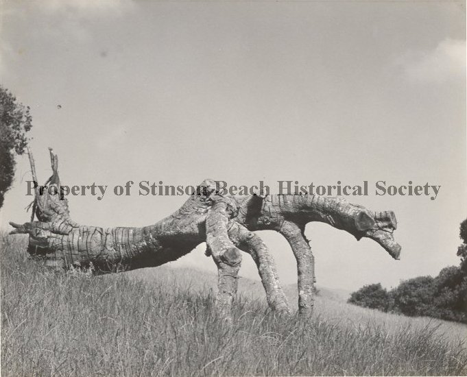 It is an artistic photograph of a large tree trunk laying on a grassy field. A large sky area behind and some trees are both sides of the subject. The trunk lays like a dinosaur. On the back the photographer has noted: May 23 1959 Chevron Isopan F. Radinal 75:1 aero#1 50/8.
