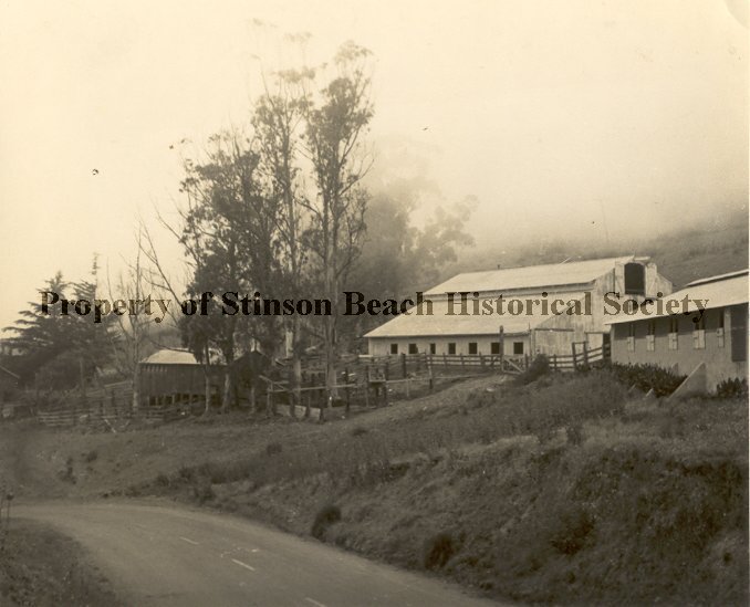 White Gate Ranch barn and other buildings as seen from a road (the curve of the road visible at bottom of photo). Large barn is nestled behind a gentle slope of the hill, enclosed by a wooden fence. A smaller barn on the right sits closer to the road but still up the hill. A small stand of Eucalyptus trees stands between the barn and another large outbuilding downslope and also fenced off. More pine trees are in the distance. Fog has settled on the hill behind - some trees disappear into it.