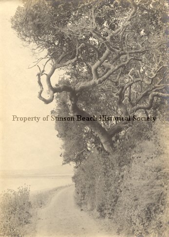 This original black and white photographic print by Edgar A. Cohen shows an overhanging oak tree above the lagoon road to Bolinas. It shows the lagoon and Bolinas peninsula in back. On the back: Photographs (stamped) #1815 Twisted Oak on Bolinas Road (In pencil) Edgar A. Cohen. Alameda Cal. (Stamped). See notes.
