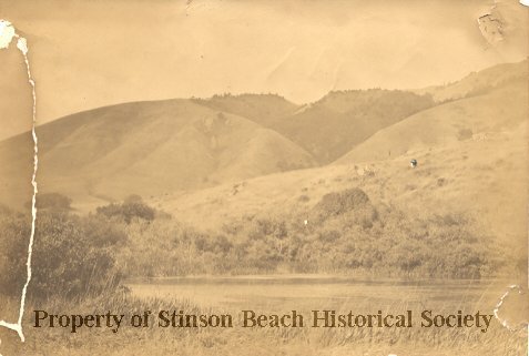 An original photograph by Edgar A. Cohen of Willow Camp Lake and Stinson Hills behind. A ranch fence in the middle of hills, now Highland area, or old Stinson Ranch. The lake is surrounded by trees and water grass. The photograph is torn, and in need of repair. On the back of photo: Photographs (stamped) #1882 Willow Camp Lake from Beach" (penciled) Edgar A. Cohen, Alameda, Cal. (stamped)