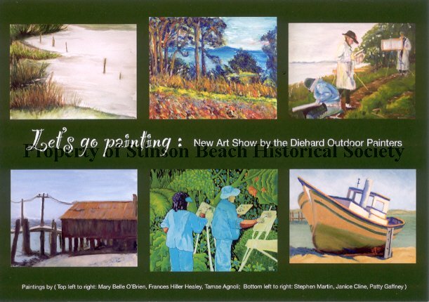 An invitation card to a painting show by the local group called Diehard Outdoor Painting Club. The show was titled, "Let's Go Painting" and held at Bolinas Gallery in the August of 2008. The artists involved were: Tamae Agnoli, Janice Cline, Patty Gaffney, Frances Healey, Mary Belle O'Brien, and Stephen Martin. This particular invitation was sent to Jane and Don Slack. The front side of the invitation shows 6 representative paintings by the artists and the back has information about the gallery, dates and time.