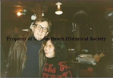 (Artist) Tamae & (Architect) Val Agnoli stand close together in what may be the Sand Dollar. Val has on a leather jacket and black t-shirt and is looking through his glasses as the camera. Tamae, wearing a black & red sweater leans into his shoulder while smiling at someone on the other side.