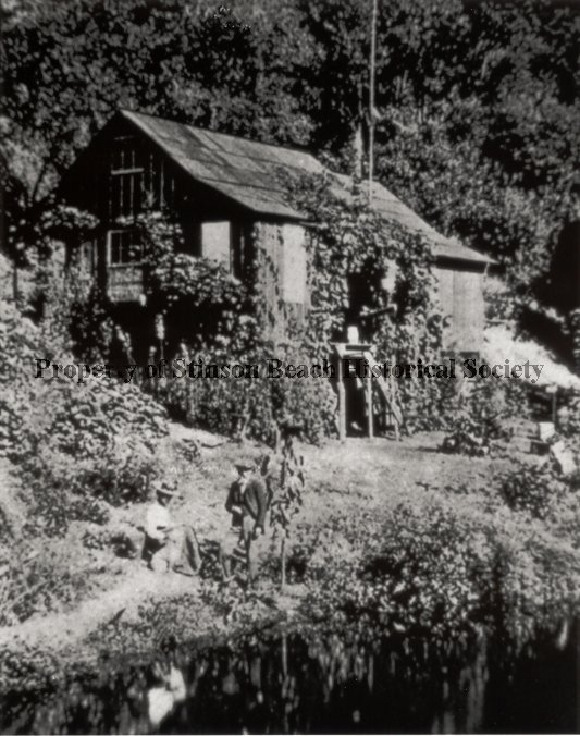An original photograph of the cabin of the painters, Thaddeus and Ludmilla Welch. The Welches and their dog are standing in front of the cabin which is located north of Stinson Beach. The cabin is surrounded by trees and vines and looks like it is located near water as there is a reflection of the scene in the foreground.