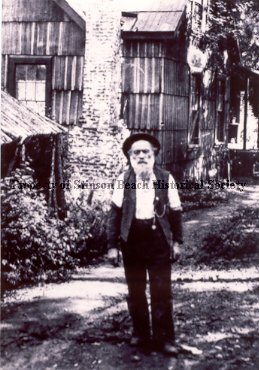 A black and white photograph of Constantine DeSella posing at the Summit House at the top of Bolinas Ridge on the Fairfax-Bolinas Road. Bolinas Museum, Jack Mason Museum and others also have this image. The Summit House has long split shingles on the roof and siding, the door has 12 lights and brick fireplace. It has a second floor (attic) with windows. There is a shed or storage building in front of the cabin near the door with a climbing plant. The bearded man stands wearing a hat, watch chain hanging from the pocket of his vest. He wears light colored short sleeved shirt with dark gaiters on arms, and dark pants.