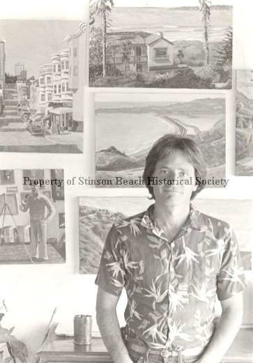 A black and white photo of Michael Knowlton, an artist living in Stinson Beach. He is wearing an aloha shirt standing in front of a display of his paintings.