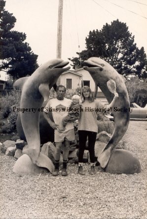 In this black and white photograph artist/sculptor Peter Bishop Allen with his child Molly on his hip and his wife Desiree Mann Allen beside him, stand between two of his giant sculptures of dolphins which arch up over their heads. Molly is a tow-headed little girl and Desiree holds something in her hand that looks like a paddle.