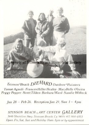 This is a postcard announcement of a show by the Stinson Beach DIEHARD Outdoor Painters at the Stinson Beach Art Center Gallery (Jan 28 - Feb 26, 1989). The 7 artists named are: Tamae Agnoli, Frances Hiller Healey, MaryBelle O'Brien, Peggy Pepper, Scott Tilden, Barbara Ward and Sandie Witbeck; however, only 6 are pictured. Who is missing?