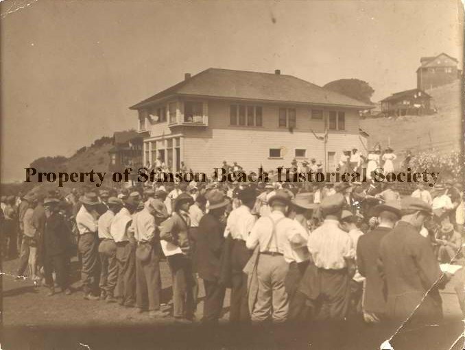 A photograph of unidentified people standing with their backs to the cameraman at the finish of the Dipsea race in front of the Airey Hotel. In the upper right hand corner going from left to right are Algar(De Camp) house and the Upton house.