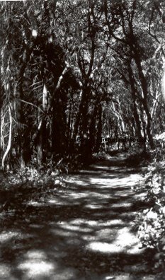 A dirt path is seen dappled by sunlight running through the branches of trees that arch over it. Trees line the path as far as the eye can see.