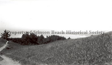 Dipsea Trail runs along left edge of photo along an open field with wild grasses. A row of trees runs along the horizon ahead, partially obscuring the view of Bolinas Bay. The western tip of Bolinas is visible.