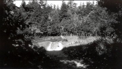 Coming out of the shade of the woods, the trail passes through a small sloping open field before it reenters the dense grove of trees on the far side. The trail looks more like a rutted track than a footpath.