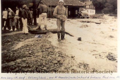 Water rushes down the street in front of the SB Fire Department building. A man (identified on photo as Al Kranzler) in high boots, safari jacket and rain hat stands ankle deep at the edge of the water with his hands in his pockets looking at camera. A group of people behind him on the left are milling around on the gravel. The woman in the white head scarf is identified as Anne Leary. Ed Leary, with his back to the camera, is standing on some sort of broken wood or concrete. The firehouse is in the background. A sedan is parked above the waterline beside it. Further on is a 2-story home, first story painted white, upper floor dark wood.