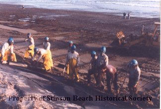 Color photograph looking toward beach from the top of rock wall being built at Seadrift. 10 workers, probably the California Conservation Corps group, are lined up at the bottom of the sand pushed up against the erosion and laying down the black plastic cloth underlayment. A buldozer stands on the back of them. The beach at low tide beyond and 2 people are standing by the surf.