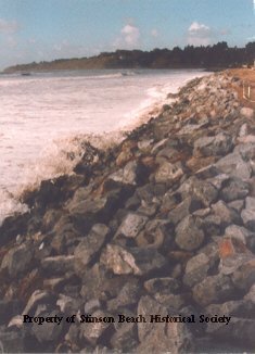 Photograph of the beach and the rock wall looking toward Bolinas point. On the back of photo is written:Rock wall finished before "grooming". The white surf is just caressing the toe of the rock wall.