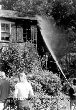 In this black and white photo a stream of water from a fire hose is being directed to the roof and upper right corner of a building. the building is Easkoot House. In the lower right hand corner the fireman holding the hose is partially cut off. In the lowerleft hand corner are two people with their backs to the camera. Therte is a man around the side of the house who is putting up a tape barrier.